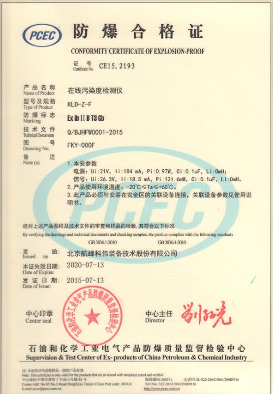日前,北京航峰自主研發(fā)的KLD-Z-F在線污染度檢測儀經(jīng)檢驗認證, 獲得防爆合格證,這是全球同類設備首次獲得此項專業(yè)資質。