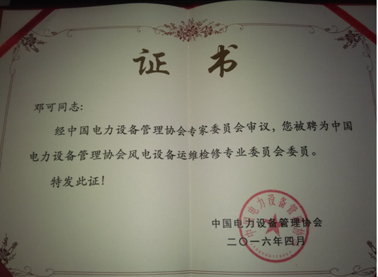 公司參加2016年4月底由中國電力設備管理協(xié)會舉辦的:“風電設備運維檢修專業(yè)委員會立大會暨全國風電設備運維檢修管理經(jīng)驗交流研討會”,本次會議主要目的是為推動風電設備運維檢修規(guī)范化、標準化管理,提升風電設備運維檢修精益化管理水平。而航峰科偉裝備技術(shù)有限公司是秉承著裝備健康主動維護方案和風電齒輪油維護及換油于一體服務供應商,在大會上也積極響應了本會議的號召,通過大會對產(chǎn)品技術(shù)服務的評比討論。最終航峰公司鄧可董事長被評為:“中國電力設備管理協(xié)會風電設備運維檢修業(yè)委員會委員。