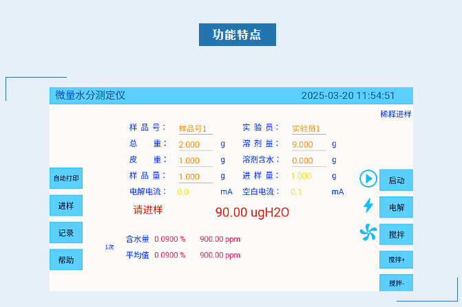 ● 液體(體積)進(jìn)樣、稱(chēng)重(質(zhì)量)進(jìn)樣、稀釋進(jìn)樣、氣體(體積)進(jìn)樣四種方式選擇,每種進(jìn)樣方式均可顯示實(shí)測(cè)水分值,并對(duì)測(cè)試結(jié)果自動(dòng)計(jì)算含水量,極大方便了測(cè)試工作;